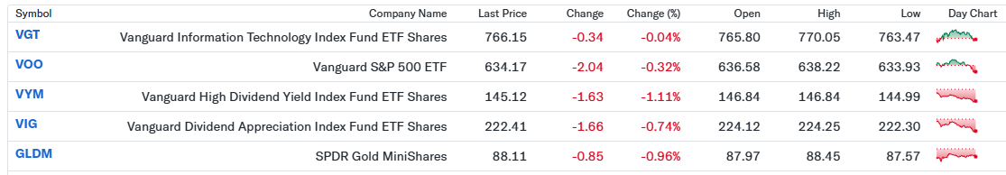 私のポートフォリオは前日比-0.56%となりました。S&P500連動のVOOや高配当ETFのVYM、連続増配のVIGが下落し、指数全体の軟調さを反映した一日でした。一方で、先端技術株中心のVGTは小幅安にとどまり、下値の支えとなっています。金ETFのGLDMも調整しましたが、これは安全資産としての役割が失われたわけではなく、短期的な利益確定の影響と考えています。高値圏での調整局面として受け止め、引き続き中長期視点で保有を継続したいと考えています。