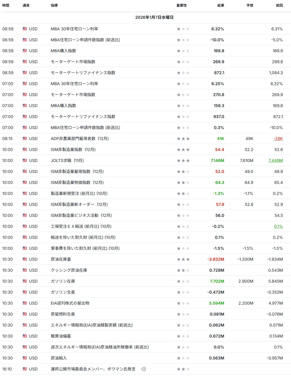 新規受注指数は57.9と前月から上昇し、今後の生産活動の先行指標として強い内容。企業の受注環境が改善していることを示し、設備投資や雇用への波及が意識される結果。景気減速懸念を後退させる材料。 - JOLTS求人件数(11月)