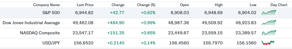 - S&P500(6,944.82、前日比+0.62%)