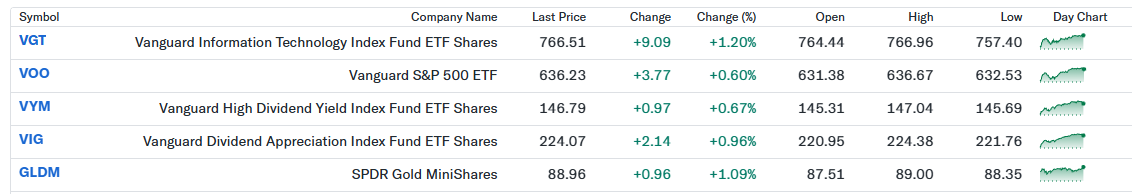 私のポートフォリオは前日比+0.81%と堅調に推移しました。VGTやVOOが上昇し、AI・半導体を中心とした先端技術(Technology)株の強さが全体を押し上げました。加えて、VYMやVIGといった配当系ETFも安定した値動きを示し、下支えとなりました。さらに、現物金価格に連動するGLDMも上昇し、株式と実物資産がともに評価される展開でした。成長性と安定性のバランスが改めて機能した一日だったと感じています。