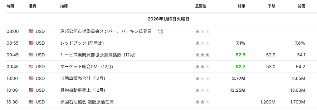 AIGがCEO退任を発表し株価が大きく反応。金融セクターでは「業績よりガバナンス(企業統治)リスク」に敏感な地合いが続き、個別材料での値動きが増える局面(Reuters:01/06) - 米PMIが小幅に鈍化、景気は拡大も“勢い一服”の示唆