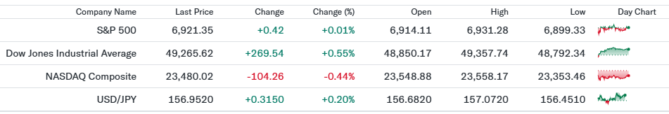 前日は小幅高で取引を終え、指数全体としては方向感に乏しい展開。大型ハイテク株の一部に利益確定売りが出た一方、金融やディフェンシブ銘柄が下支えとなり、指数は終日狭いレンジで推移。米長期金利の落ち着きと、翌日に控える雇用統計を前にした様子見姿勢が強く、積極的なリスク選好には至らない状況。セクター間での資金移動が中心となる相場環境。 - Dow30(49,265.62、前日比+0.55%)