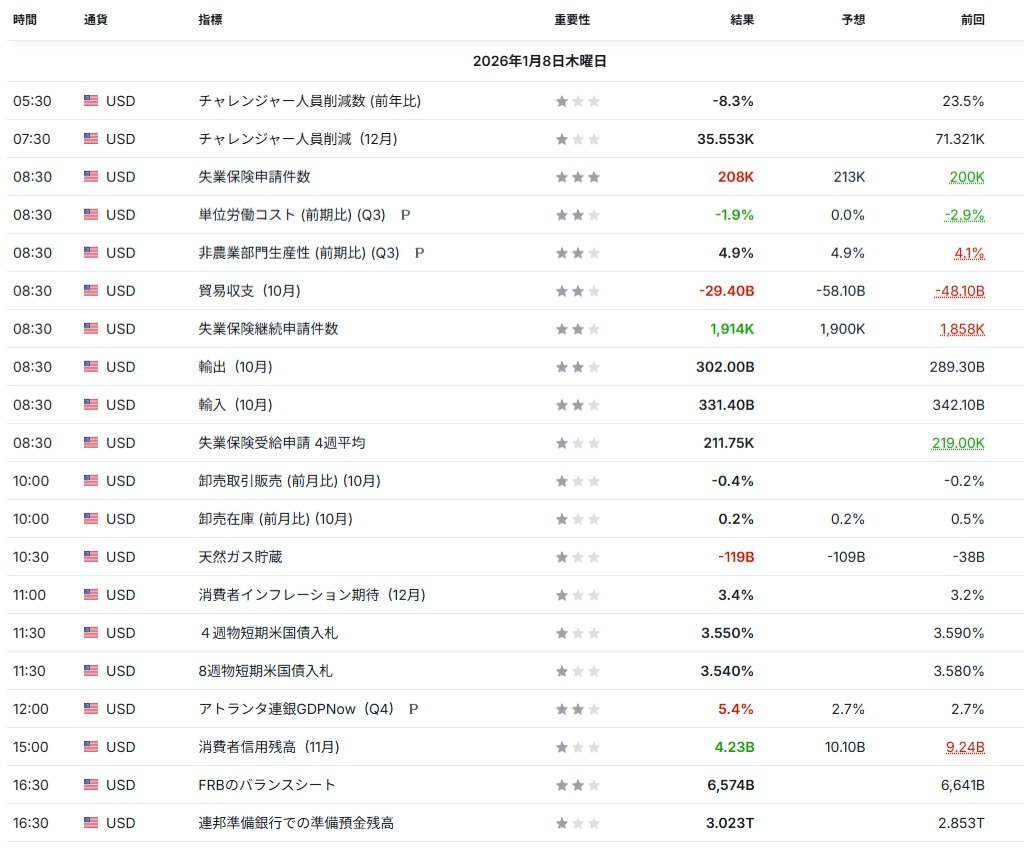 国防費増加を関税収入などで賄えるかには不透明感が残り、財政赤字拡大への警戒が浮上した。国債増発による金利上昇圧力が意識され、将来キャッシュフローを重視する成長株には逆風となりやすい構図である。(FOX Business:01/08) - 新規失業保険申請は小幅増、労働市場は安定感を維持