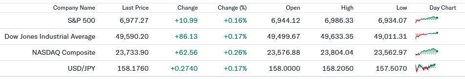 前日の下落から反発し、終値ベースで小幅高。金融政策を巡る不透明感が残る中でも、主力ハイテク株やディフェンシブ銘柄への押し目買いが指数を下支え。長期金利が高止まりする環境下で上値は限定的ながら、下値では安定した需要が確認された一日。 - Dow30(49,590.20、前日比+0.17%)