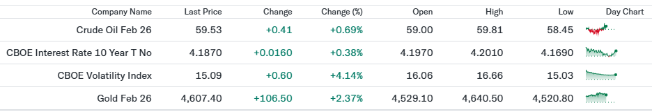 政治リスクや金融政策を巡る不透明感を背景に上昇。水準自体は歴史的に低位ながら、短期的なヘッジ需要の増加を反映。株式市場では急落警戒というより、警戒感がやや高まった状態を示す動き。 - 金先物(4,607.40ドル、前日比+2.37%)