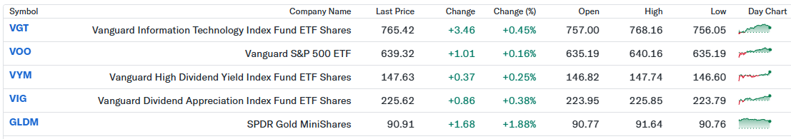私の米ドル建ポートフォリオは前日比+0.58%と堅調でした。VGTやVOOが小幅ながら上昇し、米国株全体の底堅さを素直に反映する一日だったと感じます。加えて、金価格の上昇を背景にGLDMが大きく寄与し、株式と実物資産の分散効果を改めて実感しました。高金利環境や政策不透明感が残る中でも、値動きは比較的安定しており、短期の上下に一喜一憂せず、この構成を維持しながら中長期での成長を見守りたいと考えています。
