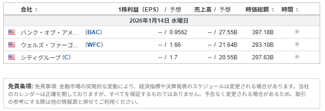 CPIで金利低下観測が出る一方、決算は強弱まちまちで指数は方向感を欠く推移。AI関連の強さが下支えする一方、金融の一角が重しとなり、指数は狭いレンジでの攻防が続いた相場。(Reuters:01/13) - JPMorgan好決算でもクレカ金利上限案が金融株の重し