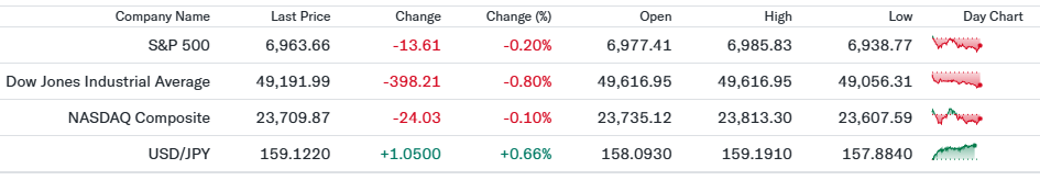 米12月CPIの結果を受けて利下げ期待が一部で意識されたものの、金融株の下落が重しとなり小幅安で推移した一日。ハイテク大型株が下支えする一方、銀行株は規制や金利先行きへの警戒感から軟調。指数全体としては方向感に乏しく、高値圏での持ち合いを続ける調整局面との評価。 - Dow30(49,191.99、前日比-0.80%)