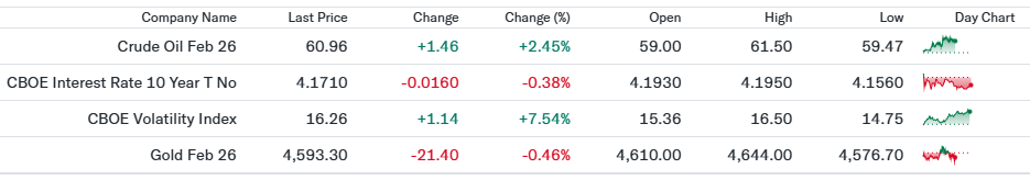 株価指数が高値圏で推移する中、調整局面への警戒から上昇した動き。金融株の下落や地政学リスクを背景に、ヘッジ需要(損失回避のための保険的取引)が増加。水準自体は落ち着いているものの、投資家心理の慎重化を示唆。 - 金先物(4,593.30、前日比-0.46%)