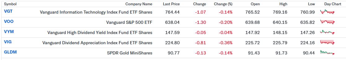 私のポートフォリオは前日比-0.19%と小幅な下落にとどまりました。S&P500連動のVOOやハイテク比率の高いVGTが指数安の影響を受けましたが、下落幅はいずれも限定的でした。一方、高配当系のVYMはほぼ横ばいで推移し、値動きの安定性を改めて感じます。金ETFのGLDMも小動きにとどまり、リスク分散の効果が確認できる一日でした。全体としては高値圏での一服感が出ていますが、短期の値動きに振り回されず、中長期の成長と配当を意識した運用を継続したいと考えています。