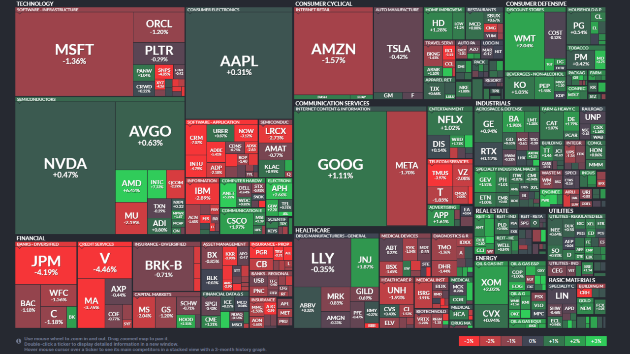 加入者数の伸び悩みと競争激化による収益圧迫懸念が重し。通信インフラ投資負担の大きさも意識され、構造的課題への警戒が強まった展開。 - JPM:JPMorgan Chase & Co(金融) -4.19%