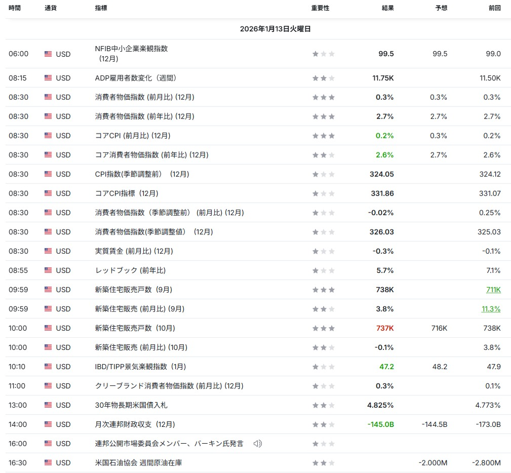 インフレ鈍化を根拠に「今こそ利下げ」と発信し、パウエル議長との対立が再燃した構図。金融政策の政治化は、市場の不確実性(先行きが読みにくい状態)を高める材料として意識される展開。(Reuters:01/13) - 米株はCPIと決算を消化しS&P500とNASDAQが小動き