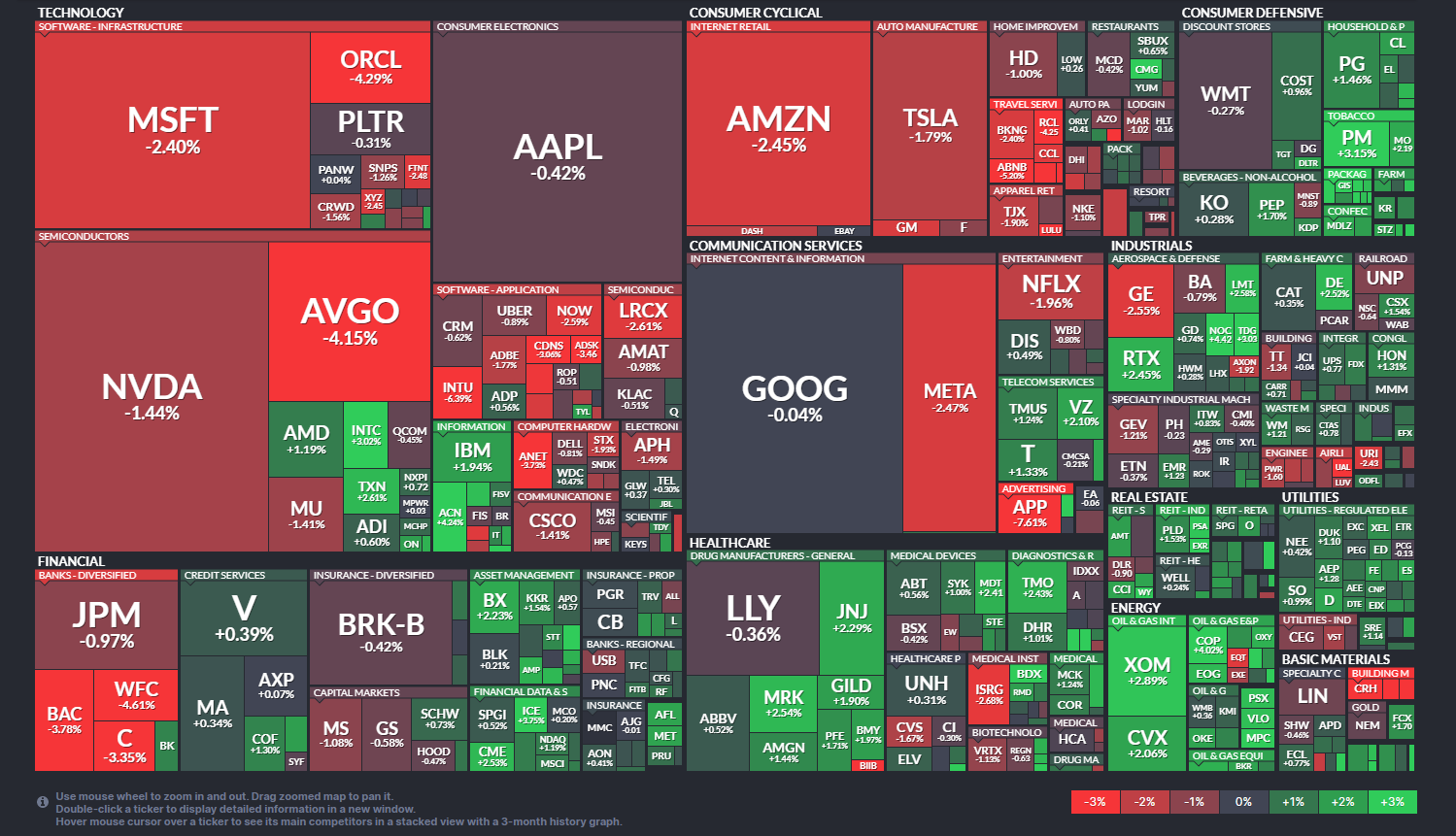 ソフトウェア大手への過熱感が意識され、ハイテク株調整の流れに巻き込まれた動き。クラウド成長への期待はあるものの、高評価修正局面で短期的な売りが優勢となった展開。 - RCL:Royal Caribbean Group(一般消費材) −4.25%