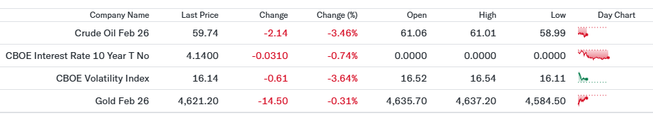 株価下落がみられたものの、急変動への警戒は後退し、恐怖指数は低下した動き。大幅下落を伴うパニック的な売りではなく、調整局面との受け止めが市場に広がった展開。 - 金先物(4,621.20ドル、前日比−0.31%)