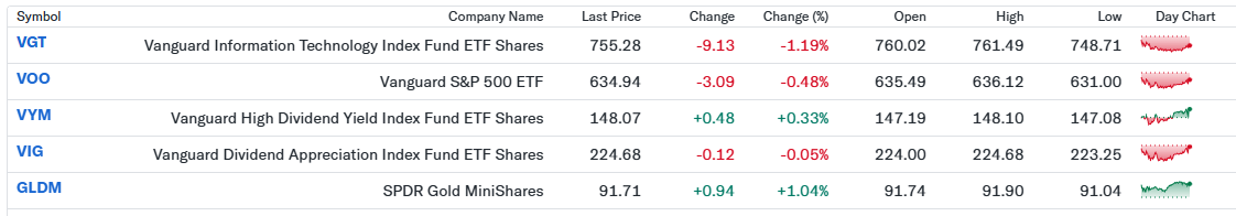 私の米ドル建ポートフォリオは、前日比−0.09%と小幅な下落にとどまりました。先端技術ETF(VGT)の下落が全体の重しとなった一方で、S&P500連動のVOOは比較的安定し、高配当ETFのVYMはプラスを確保しました。また、金価格の堅調さを背景にGLDMが上昇し、株式部分の下落を一定程度相殺してくれました。成長株調整局面でも、配当系ETFと金を組み合わせた分散効果が確認できる一日だったと感じています。短期的な値動きに振り回されず、今後も中長期視点で淡々と運用を続けていきたいと思います。