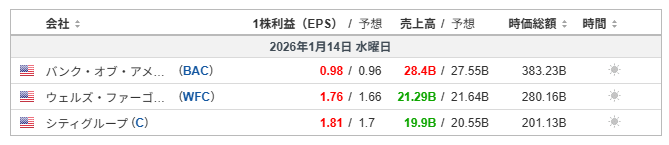 金融政策の先行き不透明感と地政学リスクを背景に、金先物が高値圏で推移。安全資産需要の高まりが株式市場のリスク回避姿勢を補強し、資金の一部が株式から貴金属へ移動した状況。(Investing.com:01/14) - 銀行株に利益確定売り