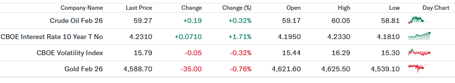 小幅高で推移し、買い戻しが優勢となった形。地政学リスクの警戒は残る一方、需要鈍化観測が上値を抑える構図。60ドル台では戻り売りが出やすく、供給要因と景気懸念の綱引きが続く局面。 - 米10年国債利回り(4.231%、前日比+1.71%)