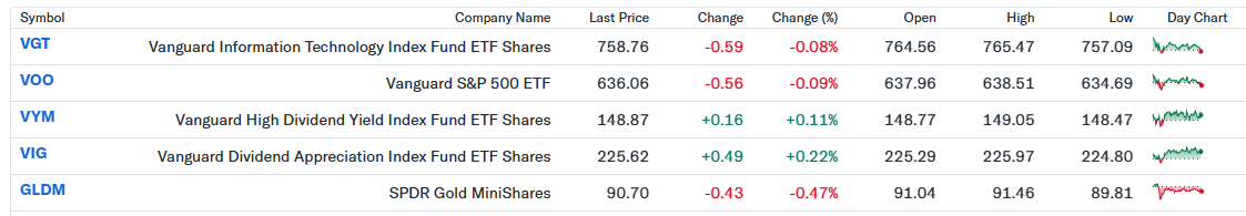 私の米ドル建ポートフォリオは前日比-0.11%と小幅な下落でした。VGTとVOOがわずかに下げた一方、VYMとVIGがプラスで下支えし、値動きは比較的安定していました。金関連のGLDMは軟調でしたが、全体では分散効果が効いており、大きく崩れない一日だったと受け止めています。