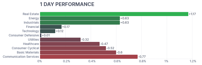 セクター別では不動産が+1%超の上昇で突出し、エネルギーと工業・産業もプラス圏を維持する一方、通信サービスや素材、一般消費材などが下落して方向感はまだら模様。金利動向と決算・材料の強弱で資金が入れ替わる、選別色の強い相場展開。