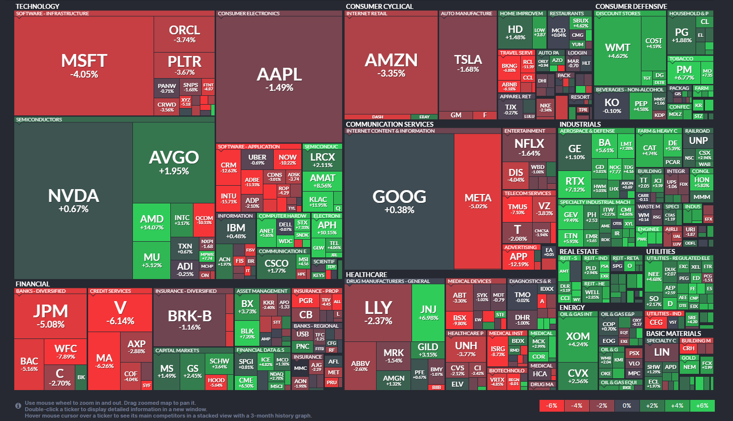 大型ハイテクはMSFTやMETA、金融のJPMなどが下押しし指数の上値を抑えた一方、半導体ではAMDやMU、装置株の一角が買われ明暗が分かれる構図。ディフェンシブではWMTやPMが堅調で資金の逃避先となりやすく、個別材料と決算見通しで売買が入れ替わる選別色の強い週。 - 1週間セクター別騰落率の背景