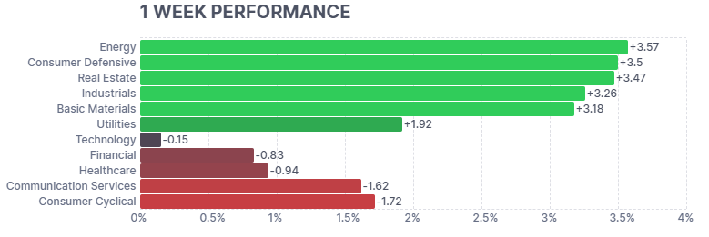 エネルギー(+3.57%)や生活必需品(+3.50%)、不動産(+3.47%)が上位となり、景気減速懸念と金利動向を意識したディフェンシブ志向が優勢。工業・産業(+3.26%)もインフラ需要で底堅い一方、一般消費材(-1.72%)と通信サービス(-1.62%)は利益確定が先行し、成長株の調整が目立つ週。
