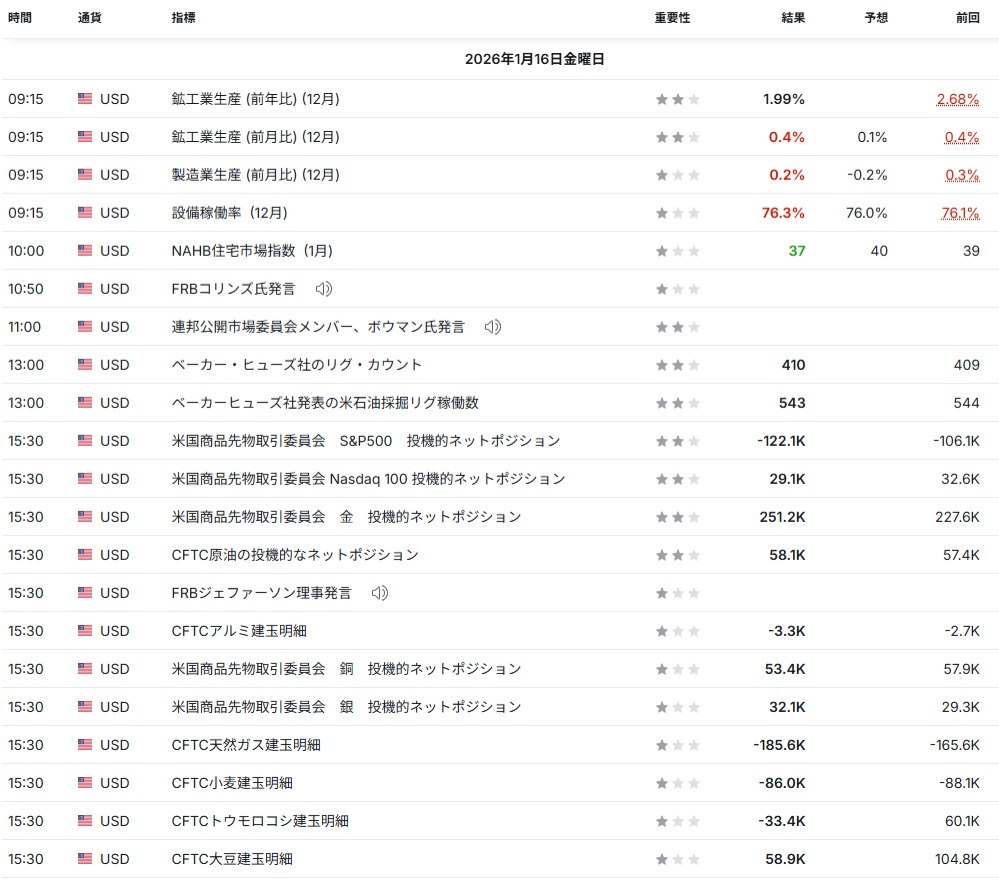 予想76.0%を上回り、前回76.1%から上昇。生産能力に対する稼働の高さが意識され、需給のタイト感(供給余力の小ささ)を示唆。インフレ圧力が再燃するかの点検材料。 - NAHB住宅市場指数(1月)37