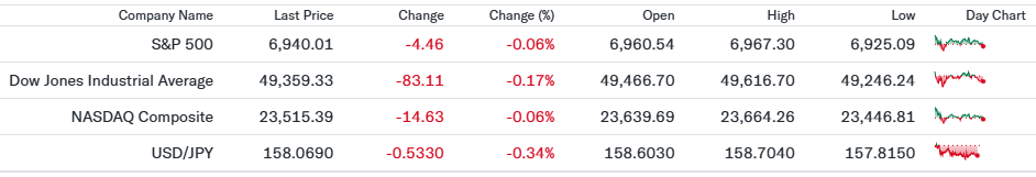 3指数の中で下げが目立ち、寄り付き49,466台からじり安で推移した形。高値49,616.70を付けた後に失速し、安値49,246.24まで下押し。景気敏感株中心の構成ゆえ、金利や景気指標への警戒が重しとなりやすい局面。 - NASDAQ(23,515.39、前日比-0.06%)