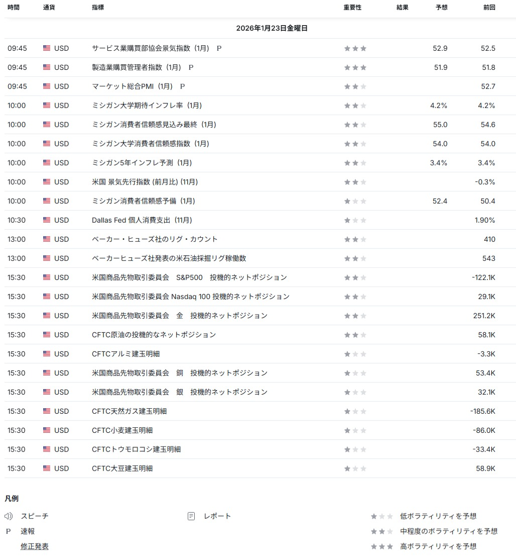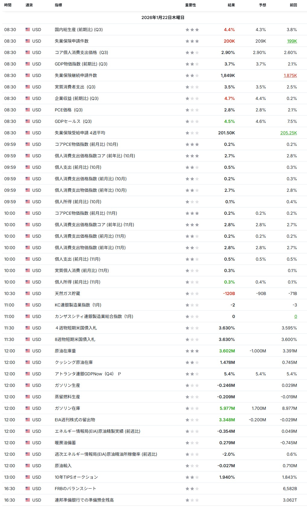 Davosでの発言と「グリーンランド協力の枠組み合意」を受け、欧州向け追加関税の警戒が後退した。貿易戦争シナリオの後退は株式のバリュエーション(株価の割高割安評価)を下支えしやすい局面である。(Reuters:01/22) - 米景気指標が底堅く利下げ期待が後ずれ