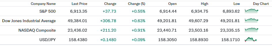 S&P500は反発し、終値ベースで堅調な推移となった。米景気の底堅さを示す経済指標を背景に、企業収益の先行きに対する過度な悲観が後退したことが支えである。一方で、FRBの利下げ開始時期が後ずれするとの見方は根強く、上値では金利動向を意識した売りも出やすい状況であった。結果として、押し目買いと利益確定が交錯する中で、指数全体としては緩やかな上昇にとどまった。 - Dow30(49,384.01、前日比+0.63%)