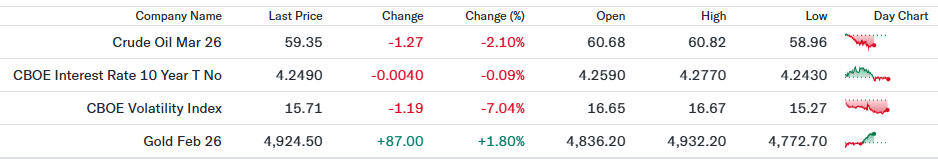 VIXは大きく低下し、市場心理の落ち着きを示した。主要株価指数が堅調に推移したことで、短期的な不確実性への警戒が後退した形である。リスクオンの地合いが続く限り、低位安定が意識されやすい。 - 金先物(4,924.50、前日比+1.80%)