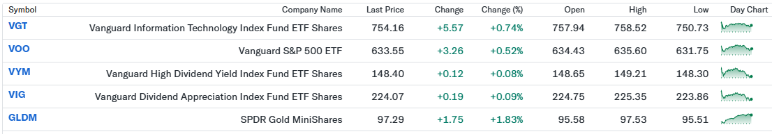 私のポートフォリオは前日比+0.72%と堅調な一日となりました。先端技術株中心のVGTや市場全体に連動するVOOが上昇し、米国株式市場のリスク選好回復の恩恵を受けた形です。高配当ETFであるVYM、増配重視のVIGは値動きこそ小幅でしたが、安定的に推移しポートフォリオの下支えとなりました。加えて、金価格の上昇を背景にGLDMが大きく上昇し、株式と異なる値動きで分散効果を発揮しています。全体として、成長性・安定性・防衛性のバランスが機能した一日だったと感じます。
