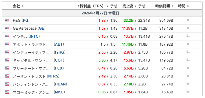 GE Aerospaceは航空機エンジン事業の堅調さを背景に、EPSが市場予想を上回った。民間航空需要の回復が整備・サービス収入を押し上げ、収益基盤の安定化が進んでいる。防衛関連需要も下支え要因であり、航空機稼働率の上昇が中長期的な業績改善期待を支える構図である。 - INTC:Intel(先端技術)
