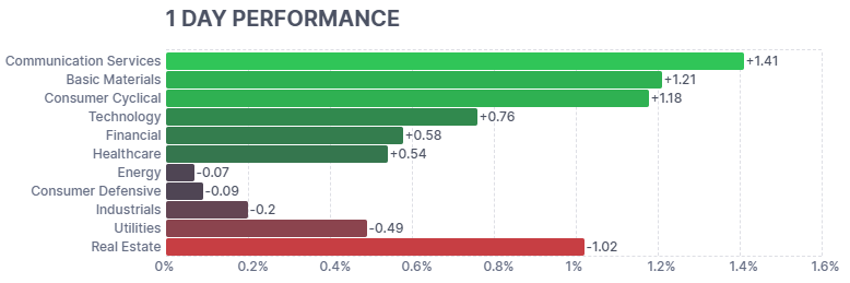 大型プラットフォーム株や広告関連銘柄が上昇し、セクター全体を押し上げた。デジタル広告需要の回復期待やAI活用による収益性改善が評価され、リスク選好の強まりが追い風となった。 - 素材(+1.21%)