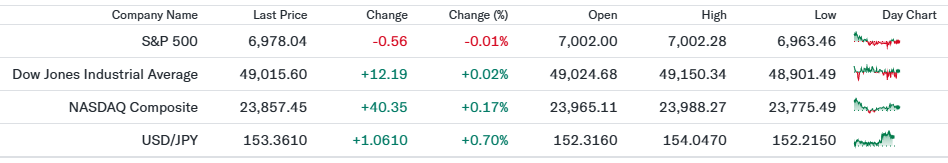 S&P500は小幅に下落し、ほぼ横ばい圏での推移となった。寄り付き直後は前日までの流れを引き継ぎ様子見姿勢が強く、高値圏での利益確定売りが上値を抑えた。ハイテク株の一部は底堅かったものの、ディフェンシブ株や一部大型株に売りが出て指数全体の重しとなった。米長期金利の動向を見極めたいとの意識が強く、積極的なリスクテイクは限定的であった。 - Dow30(49,015.60、前日比+0.02%)