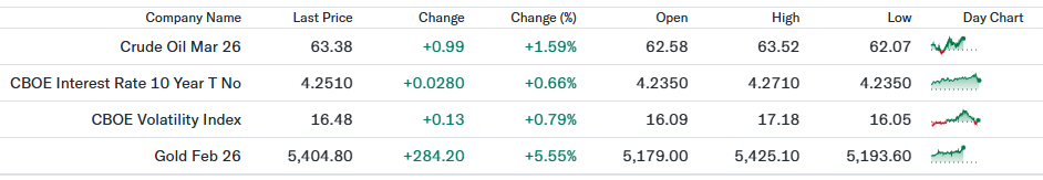 VIX指数は上昇し、市場の警戒感がやや高まった。株価指数は大きな崩れはないものの、高値圏での値動きが続く中、先行き不透明感が意識されている。イベント前のポジション調整や短期的なヘッジ需要が指数を押し上げた形である。 - 金先物(5,404.80ドル、前日比+5.55%)