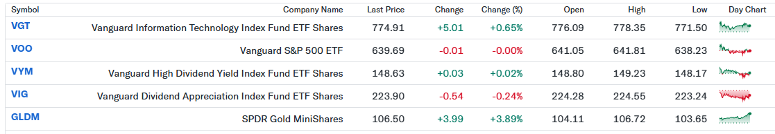 私の米ドル建ポートフォリオは前日比+0.92%と、比較的しっかりした一日となりました。先端技術株中心のVGTが堅調に上昇し、米国株市場の中でも成長分野への資金流入を実感する動きでした。一方、VOOは小動きとなり、市場全体が様子見姿勢であったことがうかがえます。高配当のVYMや増配重視のVIGは安定した値動きで、ポートフォリオの下支え役として機能しました。特に金価格上昇を受けたGLDMの大幅高が全体の押し上げに大きく寄与し、分散投資の効果を改めて感じる一日でした。