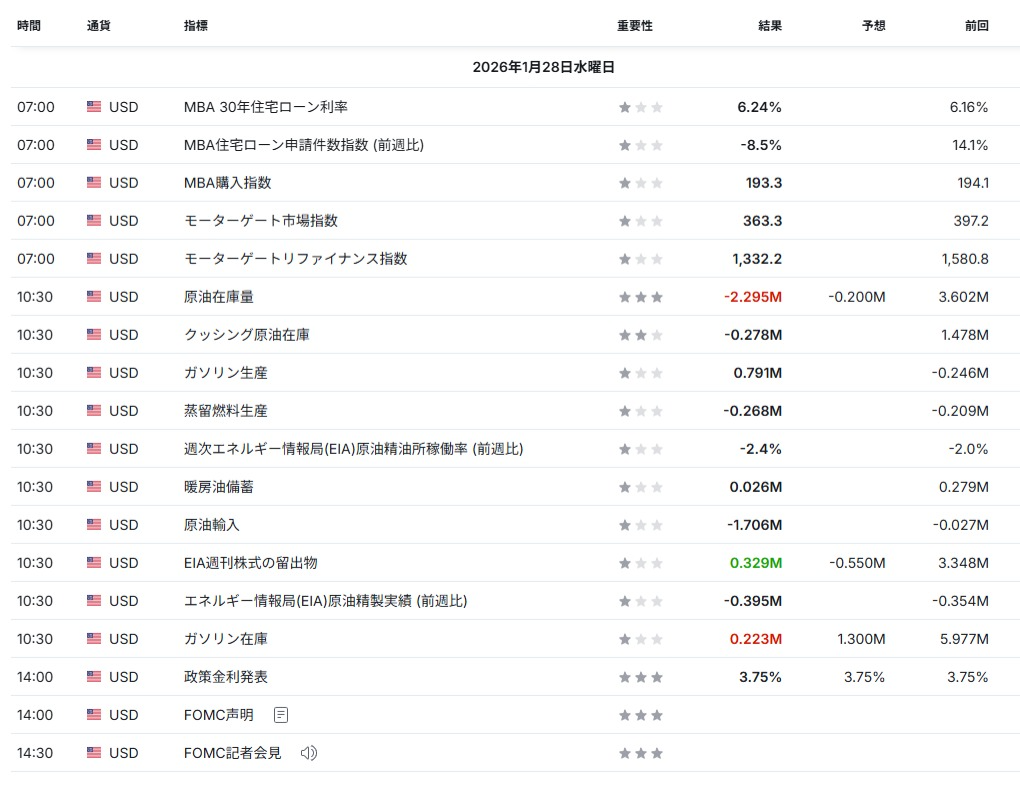 住宅ローン申請件数は前週比-8.5%と大きく減少し、住宅需要の減速が鮮明となった。金利高止まりが購入意欲を抑え、住宅市場の回復が遅れていることを示している。個人消費への波及効果も意識されやすく、景気全体に対してはやや慎重なシグナルと受け止められる内容である。 - EIA原油在庫量(-2.295百万バレル)