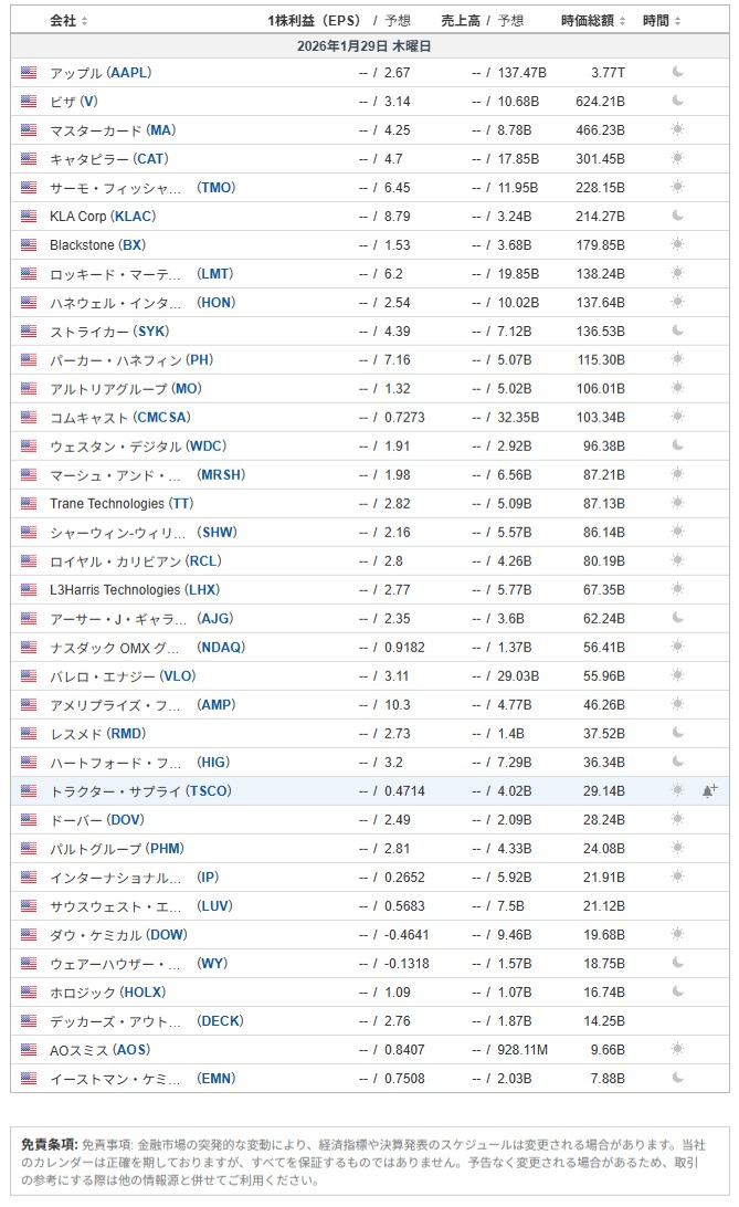 米10年国債利回りは堅調に推移し、債券市場では利回り上昇が続いた。Fedの据え置き決定を受けて債券売りが優勢となり、長期金利の上昇が金融セクターの収益見通しに影響している。(Reuters他:01/28) - 大手テック企業の決算控え 投資家心理に影響