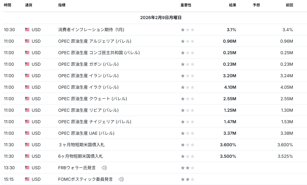 中東情勢を背景に原油が持ち直した。タンカーの航行リスクや保険コストが意識されると、原油価格の上振れが長引きやすい。インフレ指標と同様に市場の神経質さを高める材料だ。(WSJ:02/09) - FRB高官発言でドル動向への過度な警戒をけん制