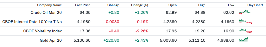 VIX指数は低下し、市場の警戒感がやや後退した。米株式指数が堅調に推移したことで、短期的な不安心理が和らいだ形である。依然として20を下回る水準にあり、急激なリスクオフ局面は想定されにくいが、指標次第では再上昇の余地も残る。 - 金先物(5,100.60ドル、前日比+2.43%)