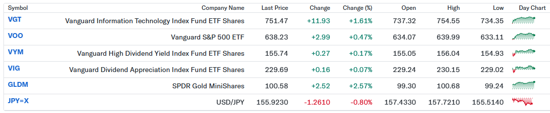 私のポートフォリオは前日比+0.95%と堅調に推移しました。VGTの上昇が全体を牽引し、米金利低下を背景にハイテク株への資金回帰が寄与したと感じます。VOOも指数上昇に連動して安定的にプラスとなり、分散効果が確認できました。VYMやVIGは値動きが小さいものの、下支え役として機能しています。一方、ドル円の下落で為替面の押し下げはありましたが、GLDMの上昇がヘッジとなり、全体として安心感のある1日でした。