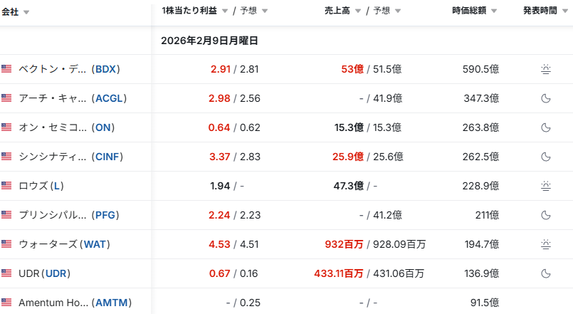 1株利益は2.98ドルと予想の2.56ドルを大きく上回った。再保険および保険引受条件の改善が収益を押し上げ、損害率も想定内に収まった。売上高の詳細は未公表だが、引受環境の良さが続いていることが示され、金利環境が落ち着く中でも高い収益性を維持できる点が投資家に好感された。 - ON:ON Semiconductor Corporation(先端技術)