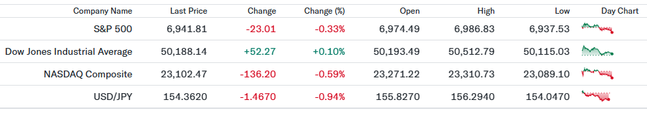 - S&P500(6,941.81、前日比-0.33%)