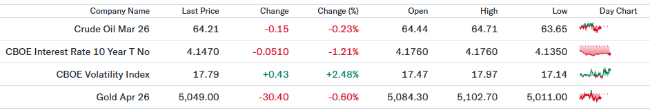 VIXは上昇し、市場の警戒感がやや高まった。主要株価指数が高値圏で不安定な動きを見せ、経済指標や決算を前にリスク回避姿勢が強まったことが要因である。ただし、パニック的水準ではない。 - 金先物(5,049.00ドル、前日比-0.60%)