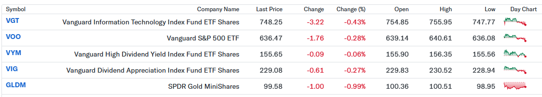 私の米ドル建ポートフォリオは前日比-0.43%となりました。先端技術株比率の高いVGTと市場全体に連動するVOOが下落したことが主因です。一方、高配当のVYMは値動きが小さく、下落局面でのクッション役を果たしました。金価格の調整によりGLDMも下落しましたが、短期的な価格変動であり、分散投資の観点では想定内と受け止めています。全体としては、米国株が高値圏で調整する中の一時的な動きであり、長期視点では落ち着いて状況を見守りたいと思います。