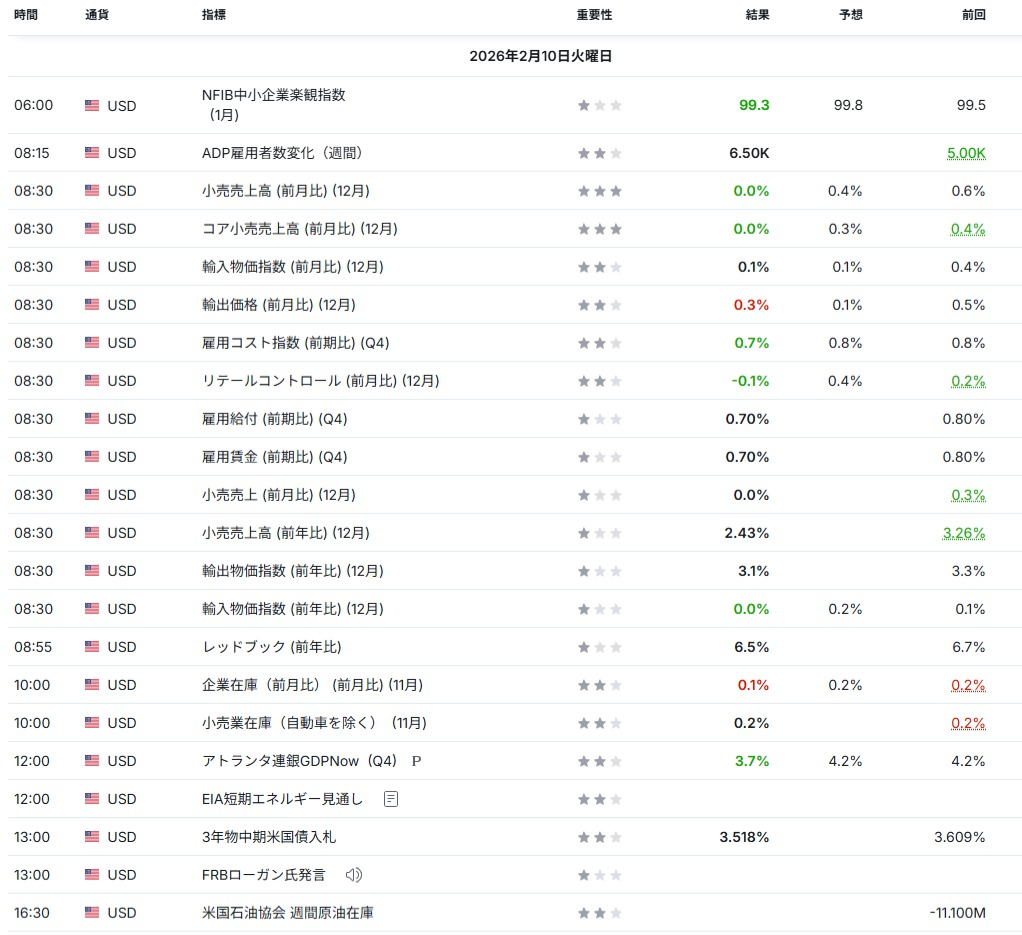 指標カレンダー上でも市場予想未達が明確で、短期金利見通し(利下げ時期)や景気敏感株の評価に直結しやすいイベントとなった。(Investing.com:02/10) - 米企業在庫の伸び鈍化、在庫循環はGDPの下押し要因