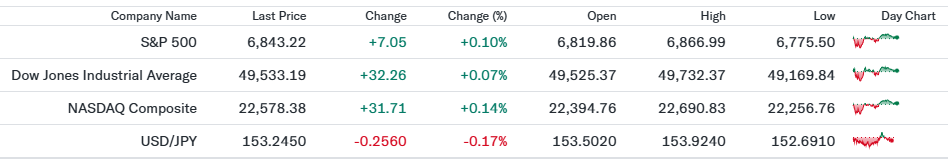 大型株を中心に底堅い推移で小幅高となった。金利の大幅上昇が見られなかったことが支えとなり、好決算銘柄への個別物色が指数を押し上げた。一方で上値追いの勢いは限定的で、利益確定売りも出やすい地合いである。 - Dow30(49,533.19、+0.07%)