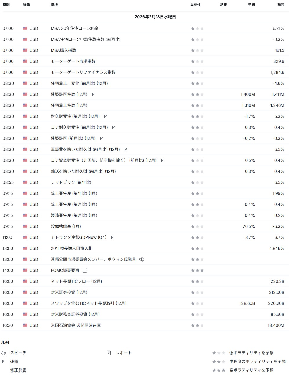 米10年債利回りが4.05%近辺へ低下し、金利上昇への警戒がやや後退したことが株式市場を下支えした。特に高PER銘柄(株価収益率が高い銘柄)への買い戻しが入り、主要指数は小幅高となった。(Reuters:02/17) - FRB高官が追加利下げに慎重姿勢