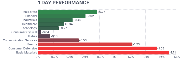 全体としては、金利低下を受けて不動産や金融など金利敏感株が上昇する一方、景気敏感セクターの一部や資源関連が大きく下落し、強弱が分かれる展開であった。ディフェンシブと素材の下げが指数の上値を抑えた構図である。