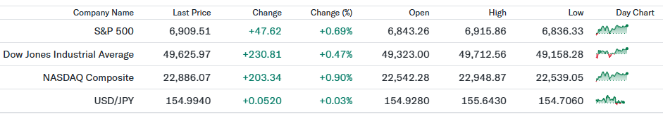 最高裁の関税差し止め判断を受け、通商不透明感の後退が好感された。半導体や通信インフラなどAI関連が買われ指数を押し上げた。一方で長期金利の上昇が上値を抑え、終盤は伸び悩む場面もあったが、リスク選好は維持された展開である。 - Dow30(49,625.97、+0.47%)